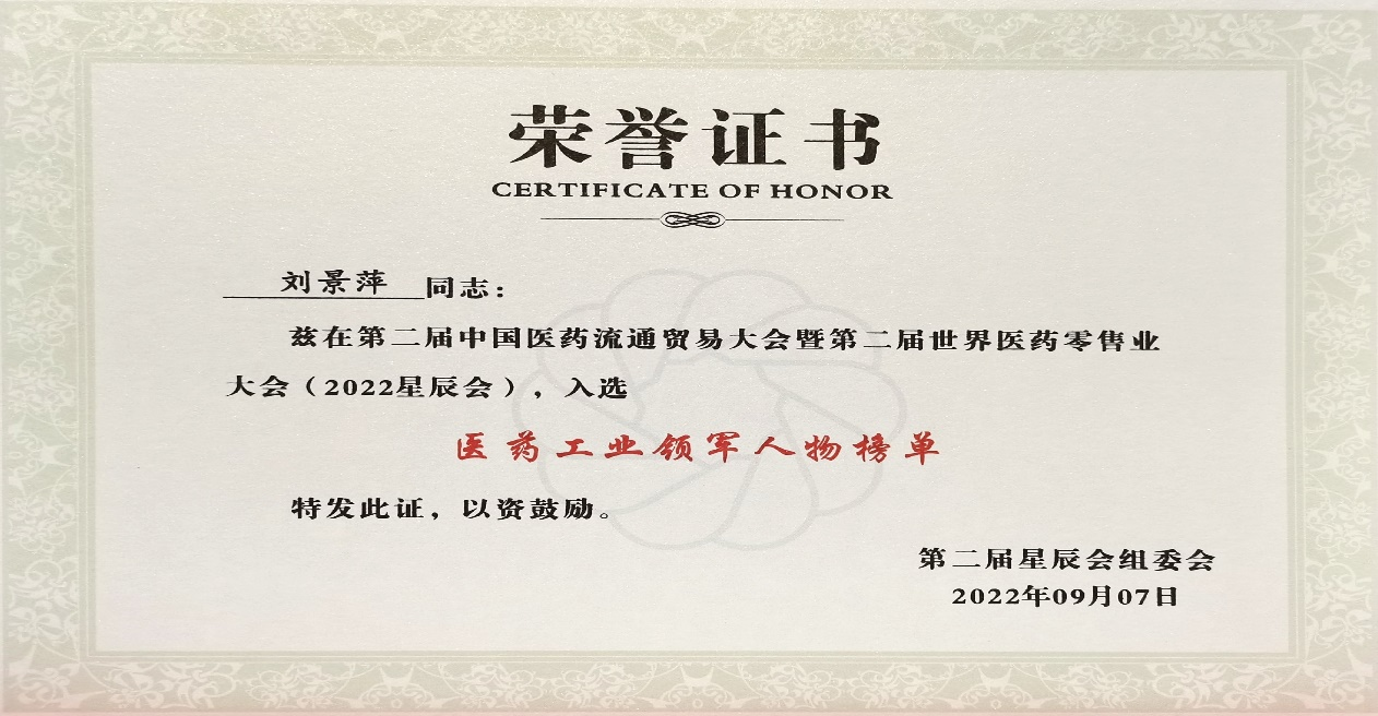 本次星辰会期间,人生就是博斩获颇丰,获得多项行业奖项及荣誉。在开幕式上,刘景萍董事长荣获“医药工业领军人物”称号。